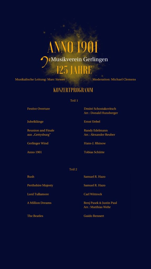 Besonders sind in diesem Jahr die beiden Werke zum Ende der ersten Konzerthälfte. Mit dem Gerlinger Wind bringen wir unseren Jubiläumsmarsch vom 100-jährigen Jubiläum erneut auf die Bühne und beschließen die erste Hälfet mit der Uraufführung von Anno 1901.